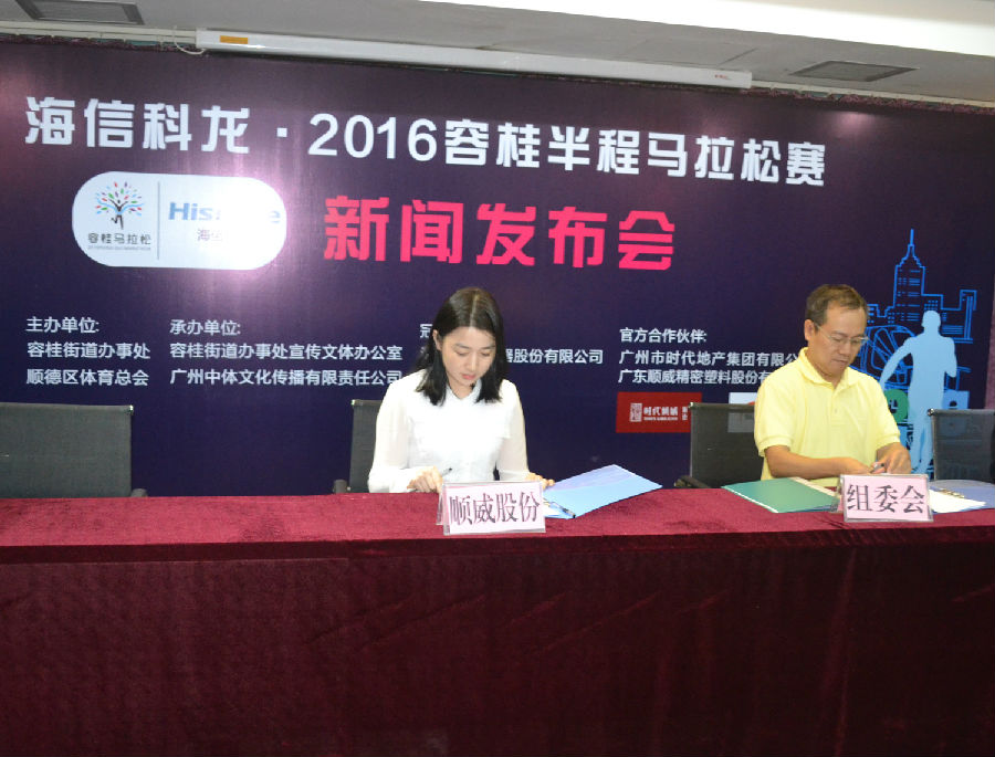 本報訊(記者:王曉菲、包燕飛)2015年11月19日下午3點,2016容桂半程馬拉松賽組委會于廣州國際生物島舉行新聞發布會,廣東電視臺、佛山電視臺、順德電視臺等多家媒體記者趕來現場采訪。順德區文化體育局副局長、區體育總會理事長羅遠光、容桂街道黨工委委員唐天培、容桂街道辦事處宣傳文體辦公室常務副主任(2016容桂半程馬拉松賽組委會秘書長)馮玉明等領導出席了新聞發布會。我司作為本次賽事的官方合作伙伴,由企業文化科科長王曉菲代表公司出席并參與簽約儀式。
