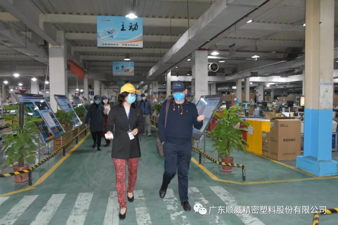 順威股份董事/總裁莫綺顏、董事/副總裁成再育、董事/副總裁/董事會秘書李笛鳴、工會主席/審計部總監童貴云、順德塑料分公司總經理范瑞強、順德模具分公司總經理龐利彬、集團戰略及商務中心/集團人力行政中心總監羅華、國內營銷中心總監助理/大客戶部高級經理王曉菲,一眾公司高管團隊在廠區廣場迎接中外媒體參觀團一行的到來。